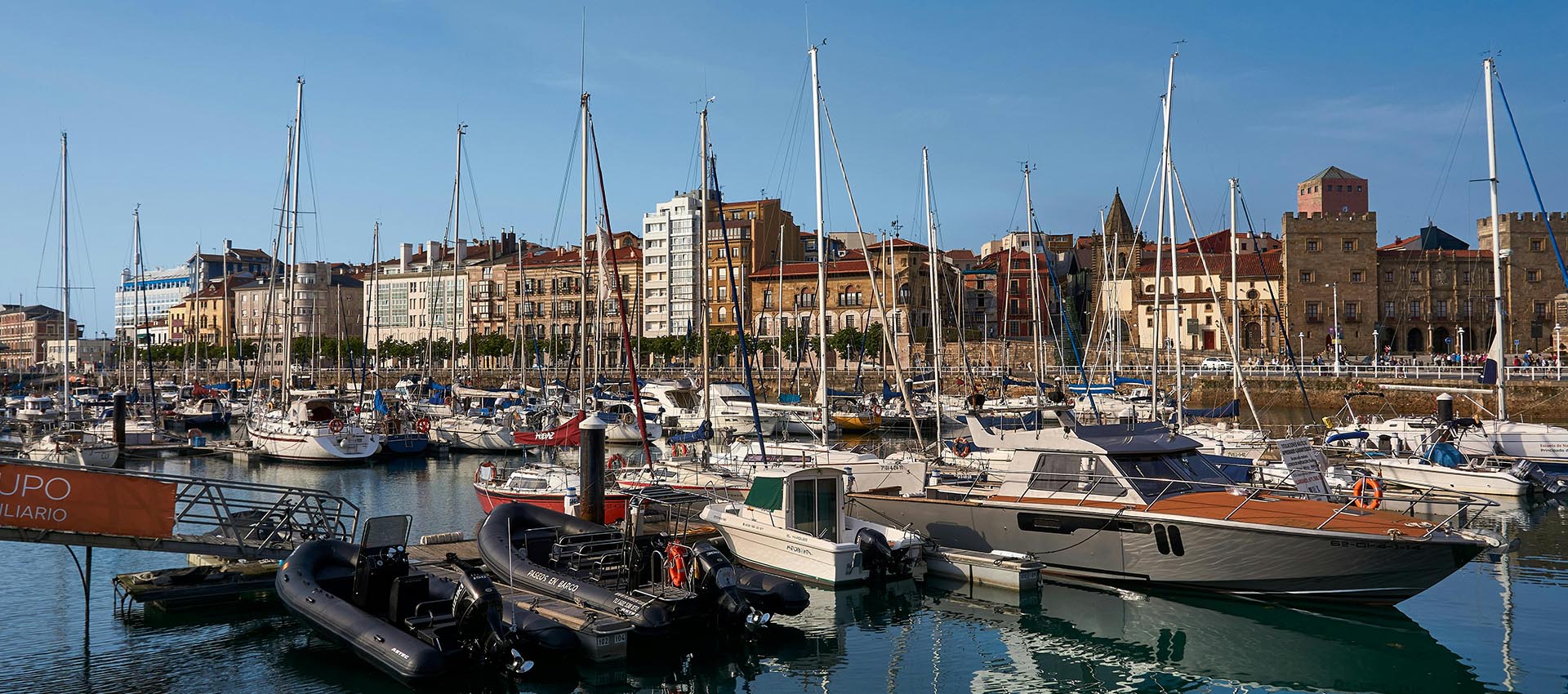 Entre ellos, el conocidísimo paseo de Begoña (ver sitios, Dindurra), el teatro Jovellanos, la calle Corrida, el Club Astur de Regatas, el puerto deportivo y la Universidad Laboral.
